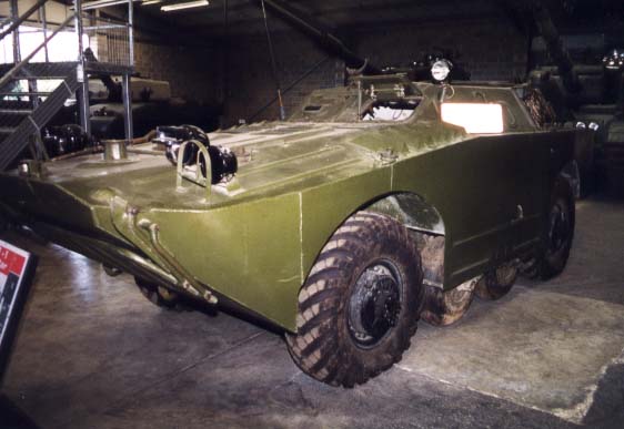 Dans l'immédiat après guerre, le blindé léger BA-64 était le véhicule de reconnaissance le plus répandu au sein de l'armée soviétique. A la fin des années cinquante, il fut rapidement remplacé par l'engin de reconnaissance amphibie BRDM-1 4 x 4 , également utilisé par les pays du pacte de Varsovie et exporté vers de nombreux pays d'Afrique et du Moyen-Orient. Toutefois, la Hongrie décida de ne pas le mettre en oeuvre; elle construisit un véhicule du même type qui, extérieurement, ressemble beaucoup au BRDM-1, bien que le moteur soit à l'avant au lieu d'être à l'arrière. Ce véhicule, le FVG, fut aussi mis en service en Tchécoslovaquie et en Pologne. Dans la plupart des unités soviétiques , le BRDM-1 a été remplacé par un modèle sensiblement amélioré : le BRDM-2. La configuration du BRDM-1 est celle d'une voiture classique. Le moteur et la boîte de vitesse sont à l'avant , le pilote et le chef de bord prennent place au centre. L'arrière ne laisse au personnel embarqué qu'un compartiment restreint, dont le seul accès est constitué par des trappes s'ouvrant dans la partie postérieur du toit. Le véhicule est équipé de roues intermédiaires qui peuvent être crabotées et abaissées par le pilote pour franchir un fossé ou un passage difficile. Cette particularité a été reprise dans le BRDM-2. Un système de réglage de la pression des pneus , monté à l'usine, permet au pilote de gonfler ou de dégonfler les pneus suivant les besoins. Sans sortir de son véhicule, il peut ainsi dégonfler partiellement ses pneus pour traverser une zone sablonneuse - la surface du pneu en contact avec le sol augmente, donc la pression au sol diminue - et les regonfler pour rouler sur route. Véhicule amphibie sans transformation , le BRDM-1 est propulsé dans l'eau par un hydrojet placé à l'arrière de la coque. Avant d'entrer dans l'eau, il est néanmoins nécessaire de relever la brise-lame placé à l'avant et de mettre en marche les pompes de cale. En configuration standard, le BRDM-1 est armé d'une seule mitrailleuse de 7,62 mm montée à l'arrière du toit. Le secteur de pointage en azimut est de 90° ( 45° à gauche et 45° à droite); le pointage en site est compris entre - 6° et + 23,5°. Le véhicule transporte 1.070 cartouches de 7,62 mm. Certains BRDM-1 disposent d'une mitrailleuse de 7,62 mm à l'arrière et d'une mitrailleuse de 12,7 mm à l'avant. Le véhicule de commandement BRDM-U possède un équipement radio plus complet; le véhicule de reconnaissance NBC, désigné BRDM-rkh, est utilisé pour baliser des cheminements dans des zones contaminées. Deux paniers montés à l'arrière de la caisse reçoivent des piquets et des panneaux. Ces paniers peuvent pivoter de 90° pour permettre la pose des balises. Trois types de BRDM-1 sont armés de missiles antichars filoguidés. Le premier est doté de 3 missiles AT1 "Snapper" portant à 2.500 m. Les rampes et leurs missiles restent sous le blindage pendant les déplacements. Elles ne sortent de la caisse qu'au moment du tir. Le deuxième type ressemble au premier, mais dispose de 4 missiles "Swatter" portant à 3.000 m. Ce modèle n'a pas été mis en oeuvre en dehors des pays du pacte de varsovie. Le troisième type, le plus récent, est équipé de 6 missiles "Sagger" portant à 3.000 m. Des engins supplémentaires sont transportés dans la caisse. Cette munition filoguidée a fait la preuve de son efficacité durant la guerre israélo-arabe en octobre 1973.